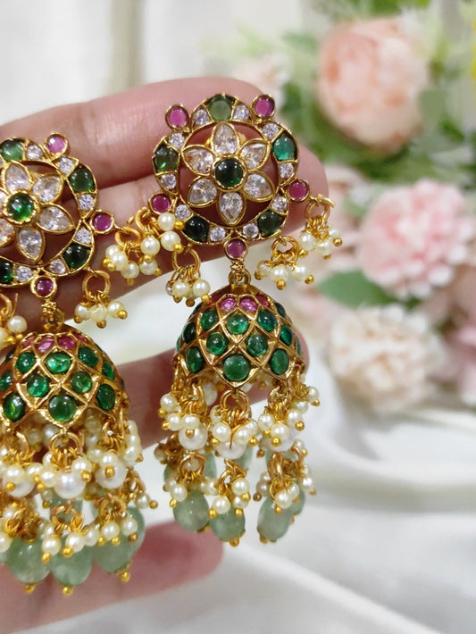 Traditional Emerald Green & Ruby CZ Long Jhumka Earrings with Pearl Drops