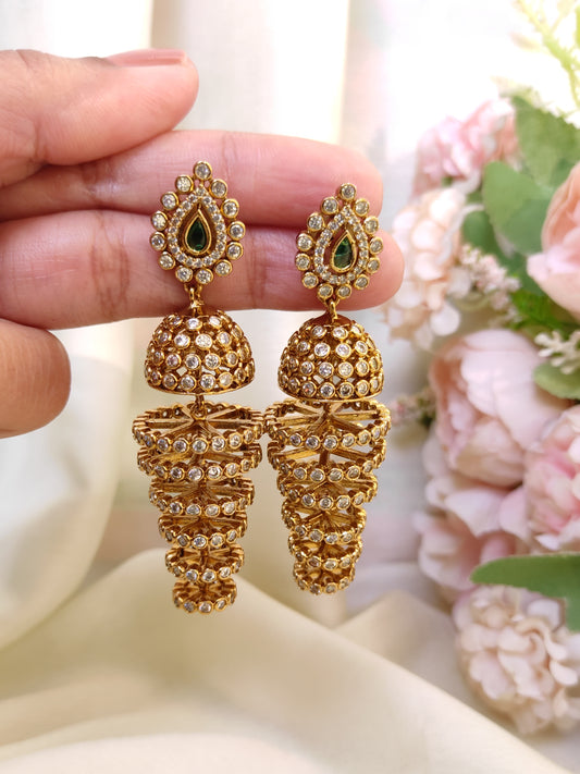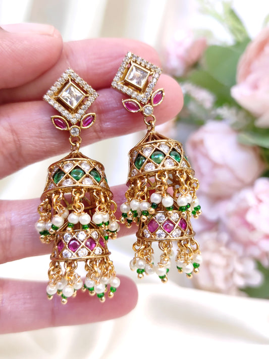 Kundan AD Dual Layer Jhumka Earrings with Pearl Hangings