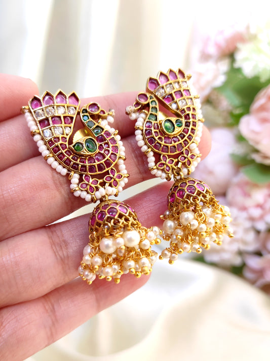 Peacock Design Ruby Pink & Emerald Green Stone Jhumka Earrings with Pearls