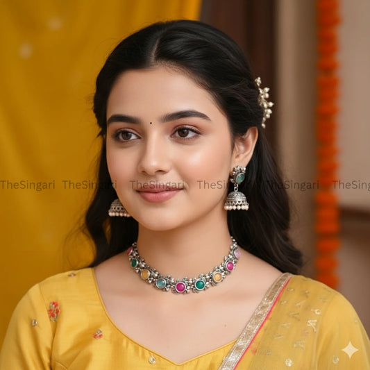 Ethnic Silver Plated Designer Necklace Set in Multicolour