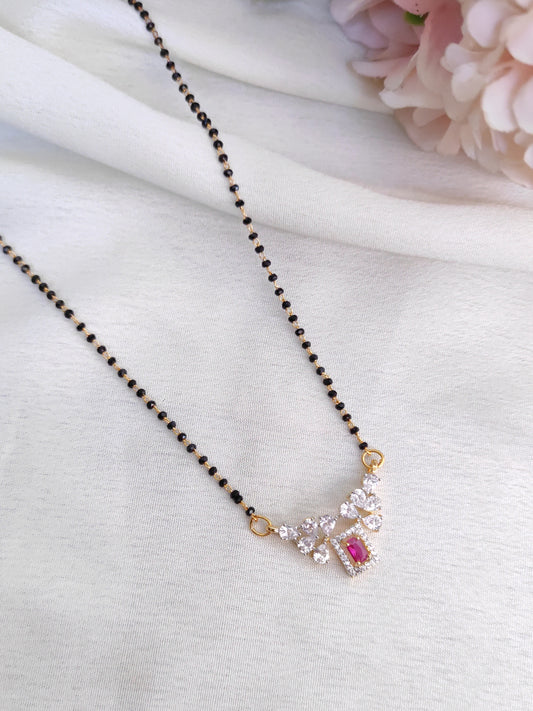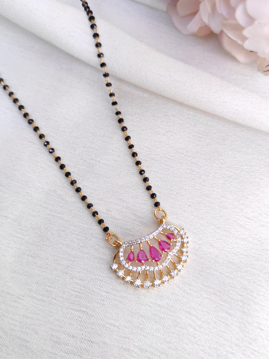 Ruby Pink AD Fan Pendant Black Bead Chain – Elegant Daily Wear Mangalsutra