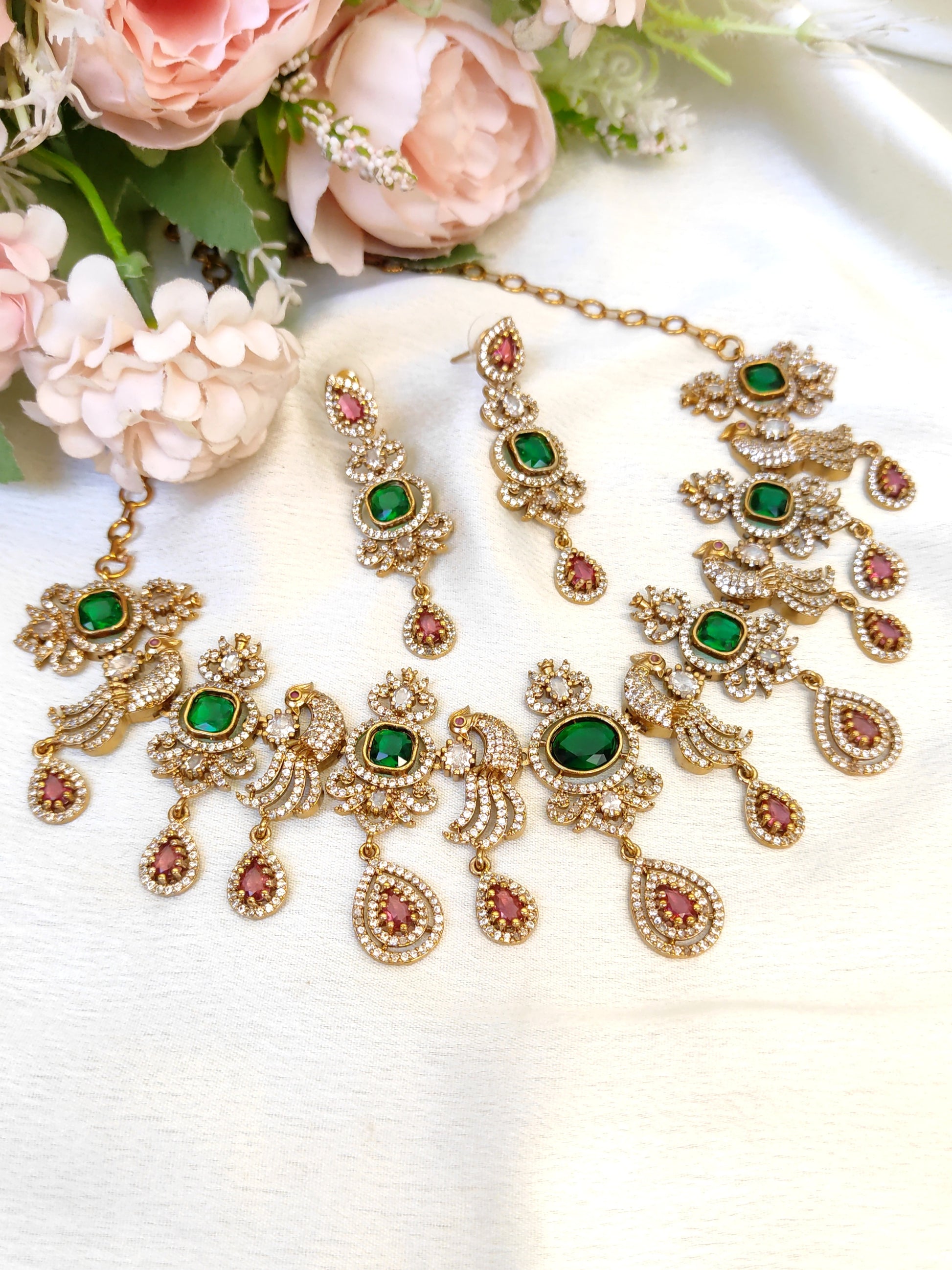 Bridal Peacock Motif Necklace Set | Green CZ Stones & Pink Tear Drops